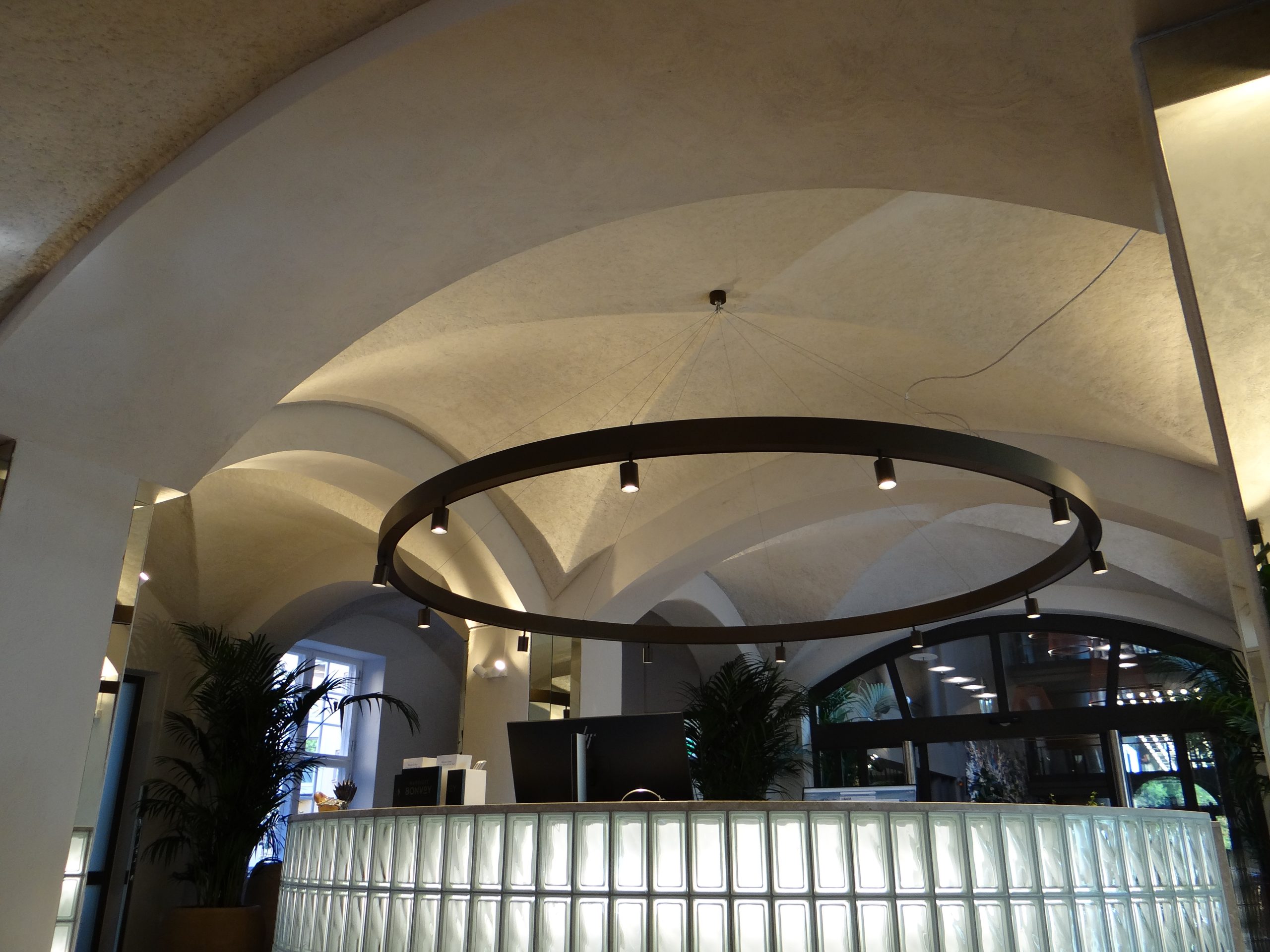 SprayTec vald för taken i hotellfoajén där de välvda strukturerna är sprayade för att uppnå högsta ljudarbsorptionsklass och samtidigt behålla takhöjden och den ursprungliga formen av valven.